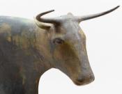 Large swell-body steer weathervane, copper. This weathervane sports a nicely weathered surface with traces of gilt remaining. It is mounted on an unusual incised marble base (not original). The weathervane is in very good condition, with a few dents, a minor seam separation and no indication of any repairs. Late 19th century, American.