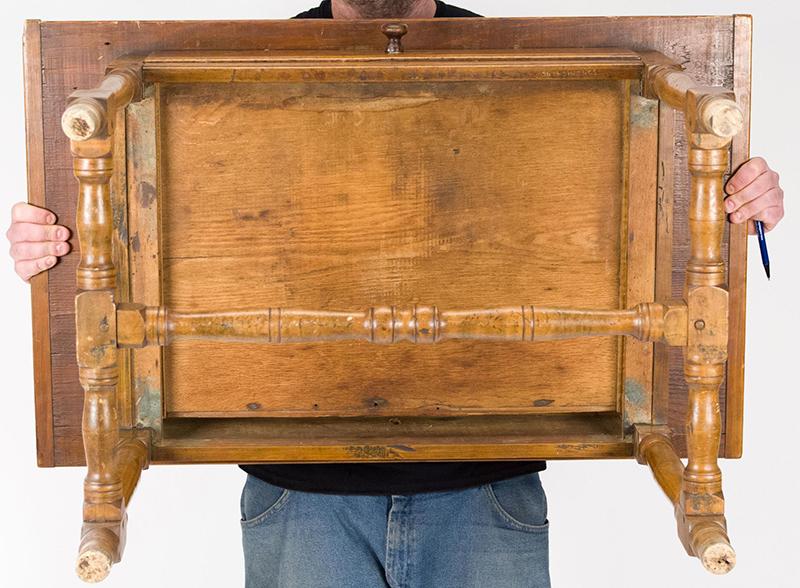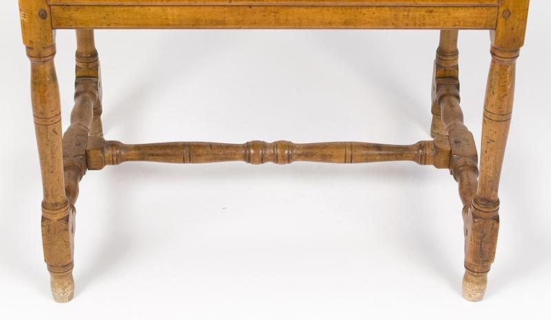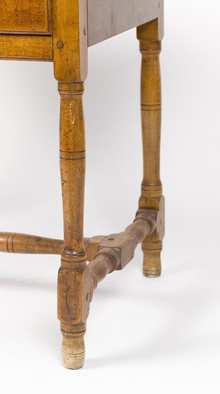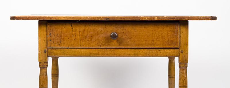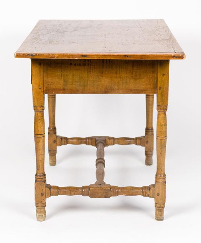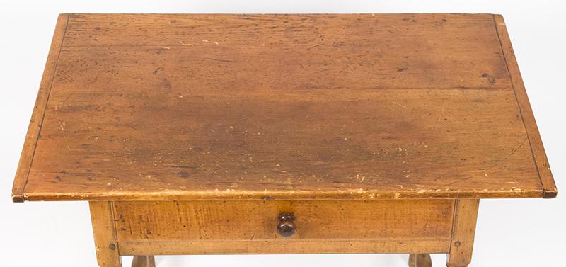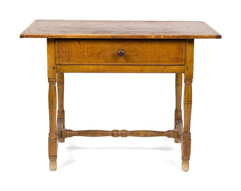 Early 18th century tavern table, pine and maple. The table sports a single board pine top with breadboard ends and a maple base with a figured maple drawer and a well-turned medial stretcher. The table is in very good condition with a nice warm patina. (The discoloration of the feet seen in the photos has now been stained to match the rest of the legs.) Circa 1760, New England.