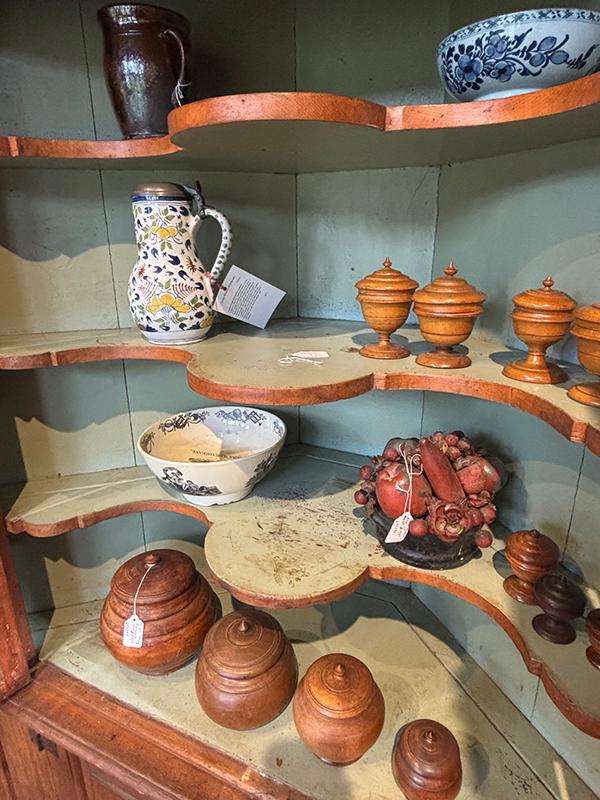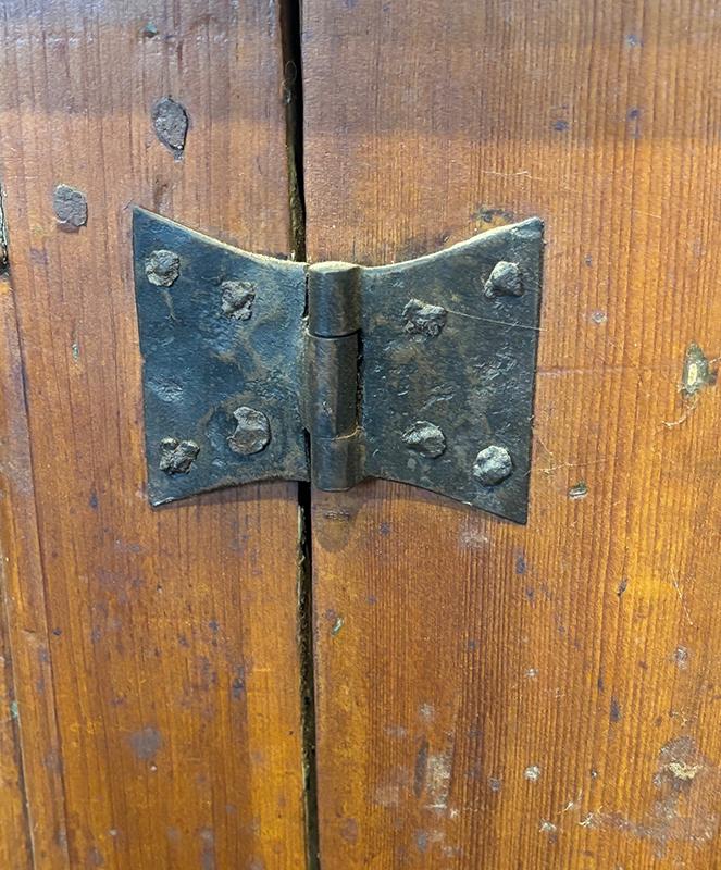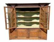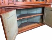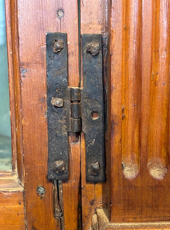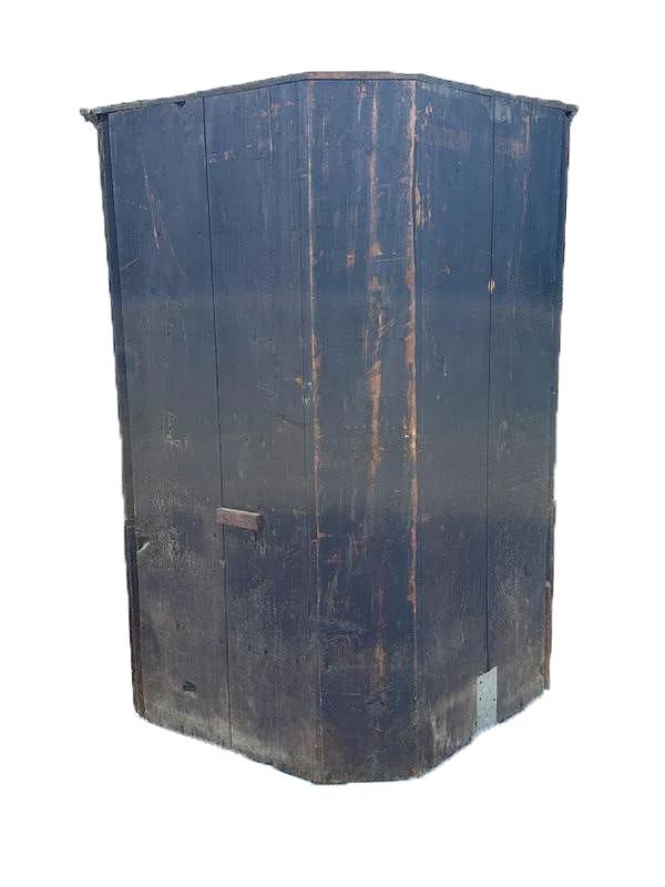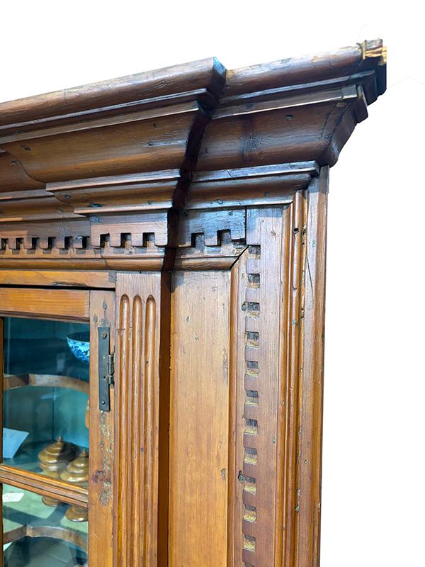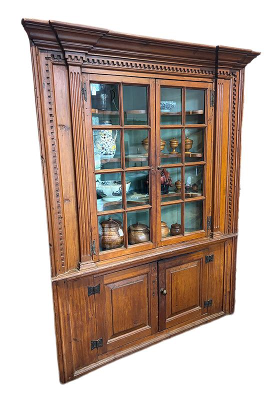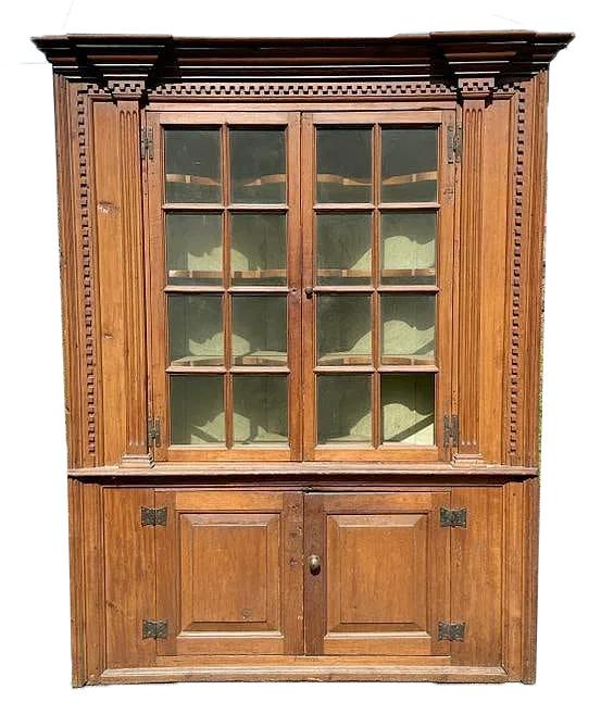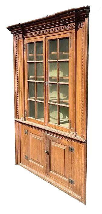 Exceptional architectural-form corner cupboard, pine. The cupboard sports an extremely bold cornice, attractive dentil molding, two glass doors above with mostly original wavy glass panes, butterfly shaped shelves, and two raised panel doors below. The ”H” and butterfly hinges are original although the H” hinges have been moved. The brass knobs on the doors are replacements. The cupboard is in very good condition. It was found in a stone house in Stone Ridge, NY. Circa 1770-1790.