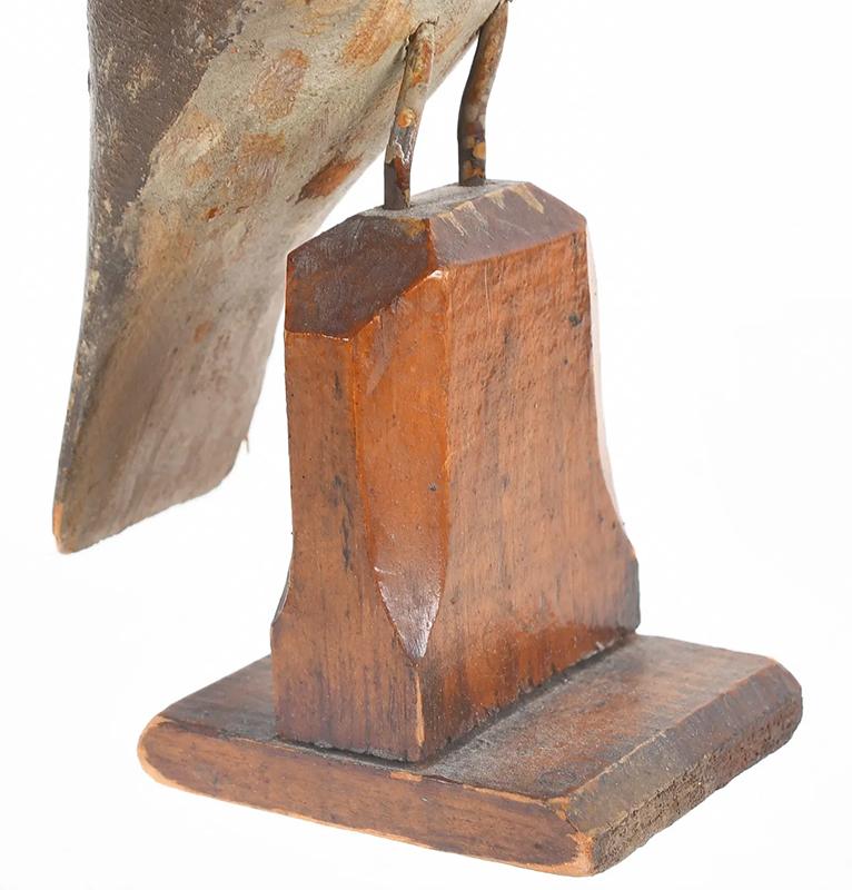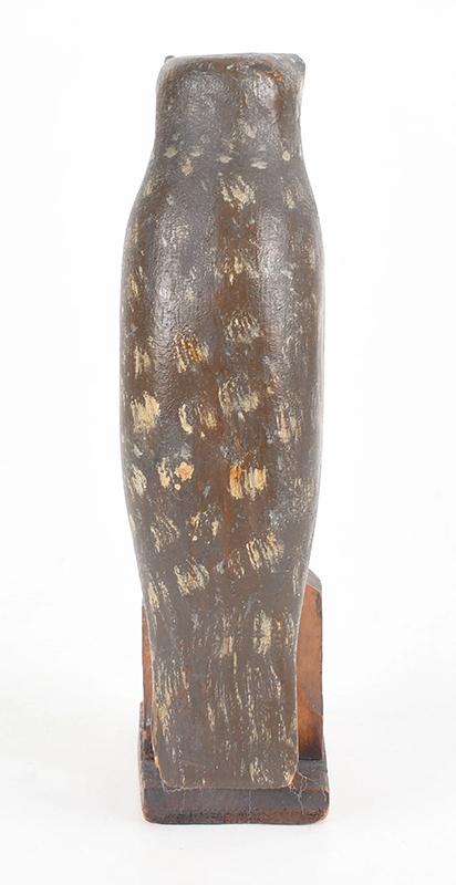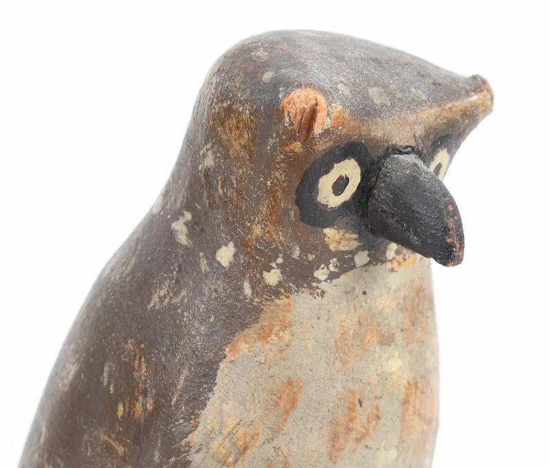 Folk art carved and polychromed wooden owl. The owl sports original paint and is raised on a carved plinth base. It is in excellent condition. Early 20th century, American.