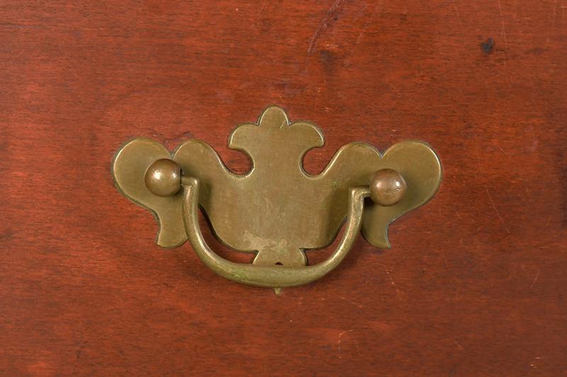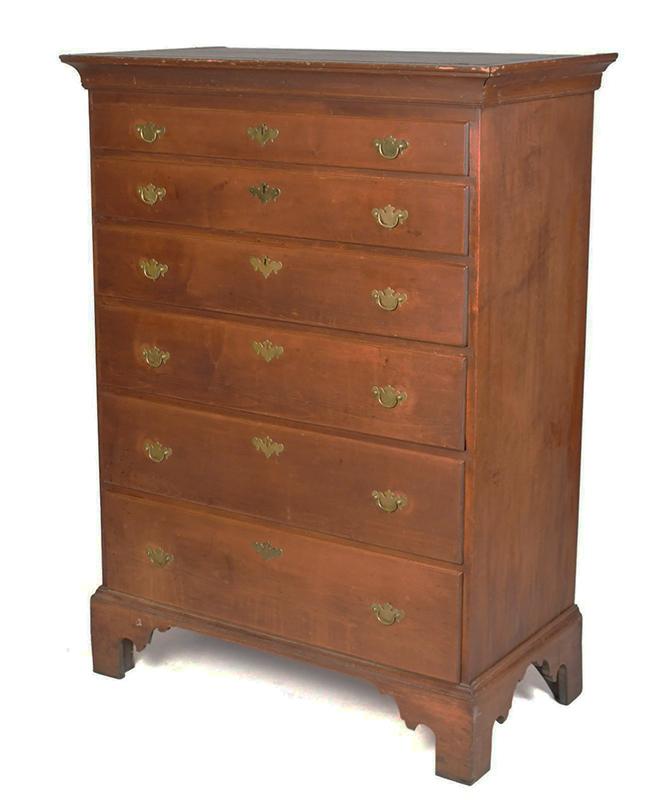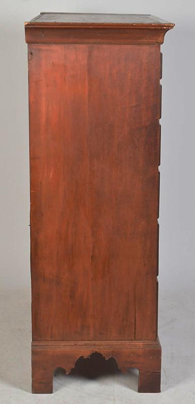 Chippendale high chest of drawers, maple. The chest sports an old red surface, with a dovetailed case, an applied molded top over six graduated drawers with original brasses, supported by a bold bracket base with attractive cutouts on the apron. The chest is in good condition, with minor repairs and wear commensurate with its age. Circa 1780, New England.