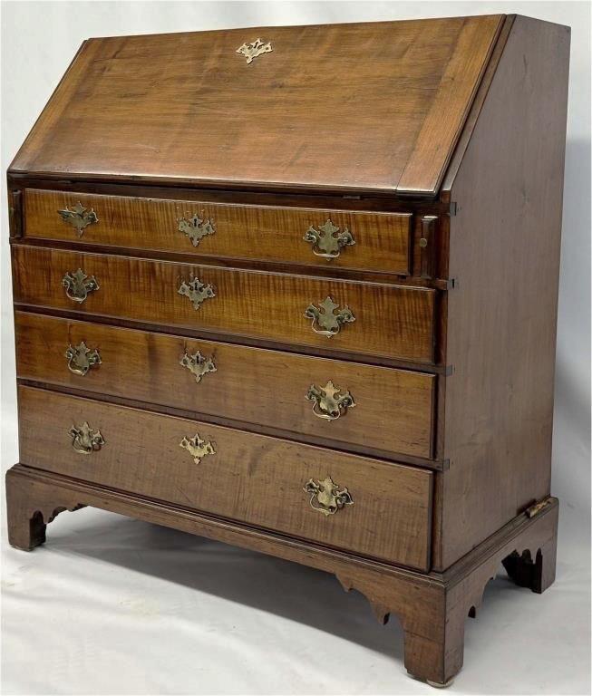 Chippendale tiger maple slant-front desk. The desk sports strong tiger striping, an attractive interior with drawers and cubbies, and a strong Chippendale base with attractive cutouts. (The missing brass drawer pulls on two interior drawers will be replaced.) The desk is in very good condition, marred only by a very slight warpage of the lid and minor wear and tear from age and usage. Late 18th century, probably New England.