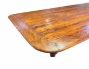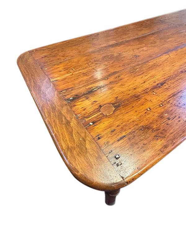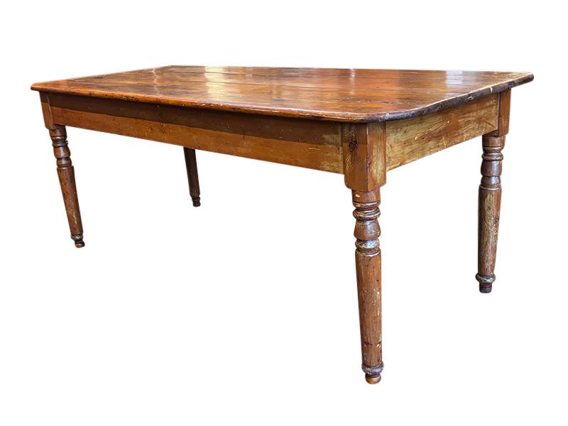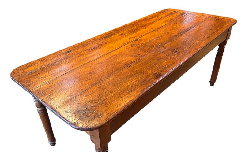 Country farm table, pine. The table sports a three-board top, turned legs and an attractive soft finish. It is sturdy and in very good condition, with a repair to one end of the top and the expected wear and tear from age and usage. The legs have been extended by about an inch for more comfortable seating. Circa 1850, New England.
