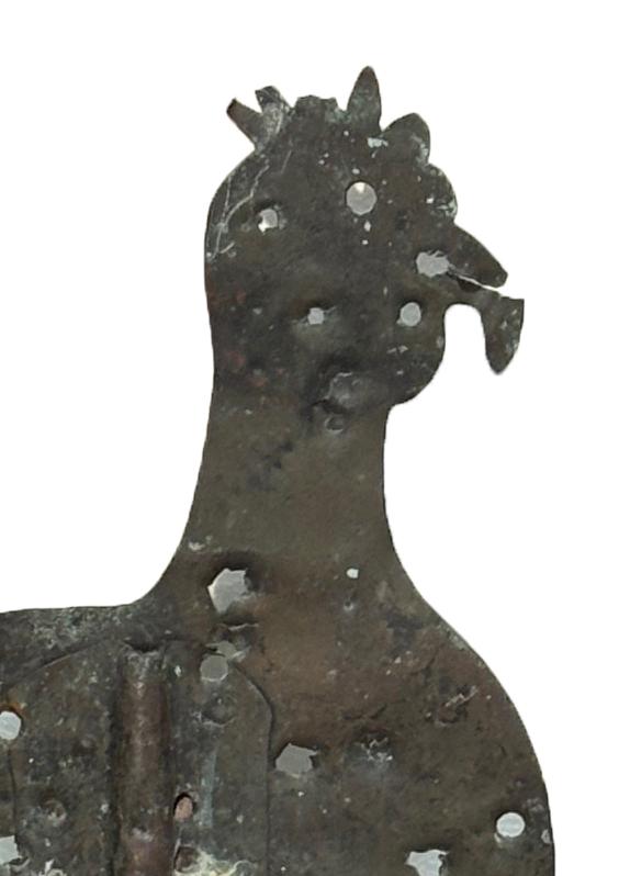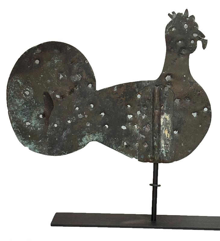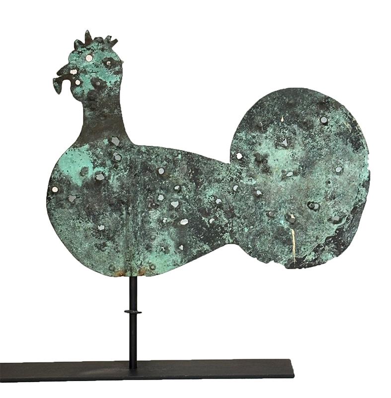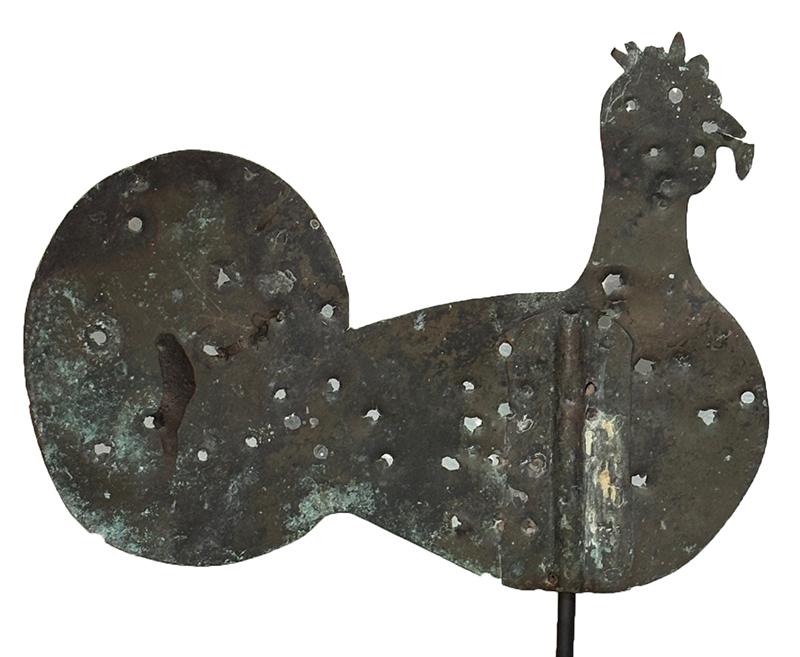 Folk art sheet copper rooster weathervane. The weathervane has a very attractive whimsical form that was obviously an irresistible attraction for target practice. It sits on a modern custom made stand. This weathervane was taken from our own collection after many years of ownership. Late 19th century, American.