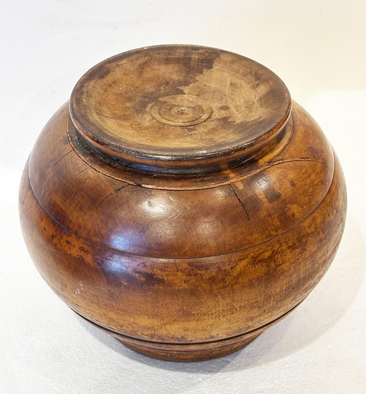 Large peaseware covered jar. The jar sports a turned bulbous shape with concentric rings, a pronounced foot and a turned acorn finial on the lid. It is in very good condition, marred only by hard-to-see shrinkage cracks near the base. 19th century, Ohio.