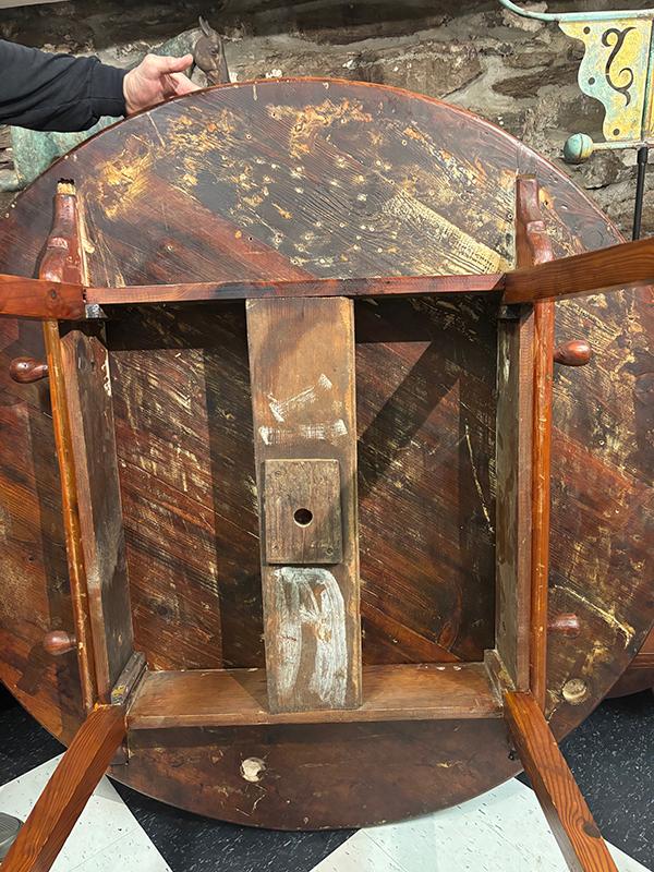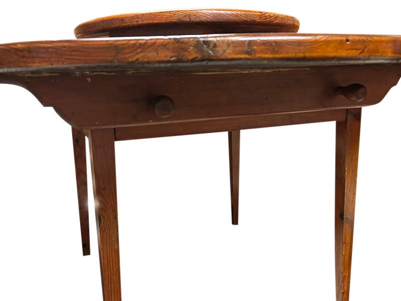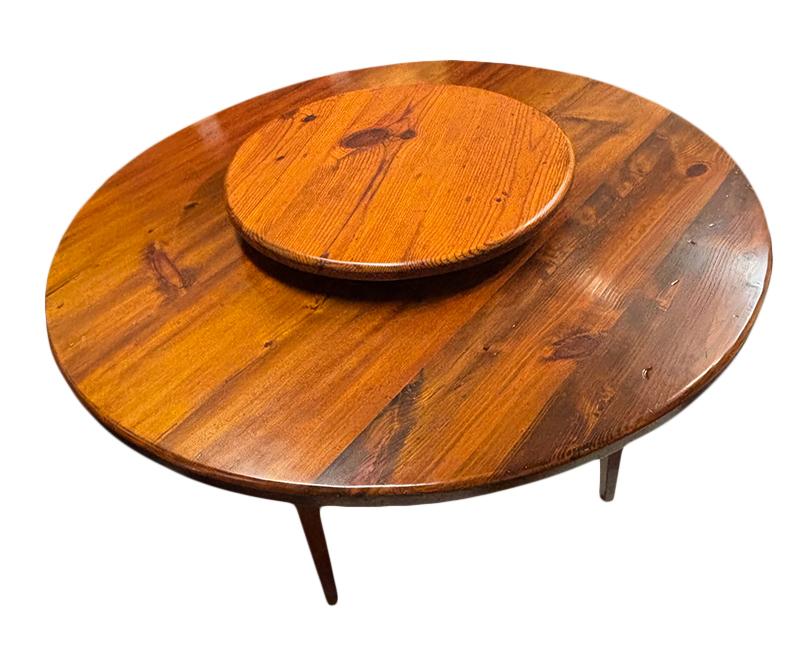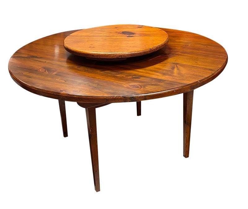 Lazy Susan table, Southern hard pine. This hard-to-find table sports a soft refinish and is in very good condition, ready for everyday use. The underside of the top was evidently used for some sort of woodworking project before the table was constructed, as evidenced by paint stains and a number of drilled holes. Early 20th century, Southern U.S.