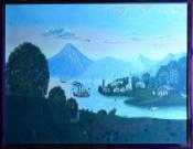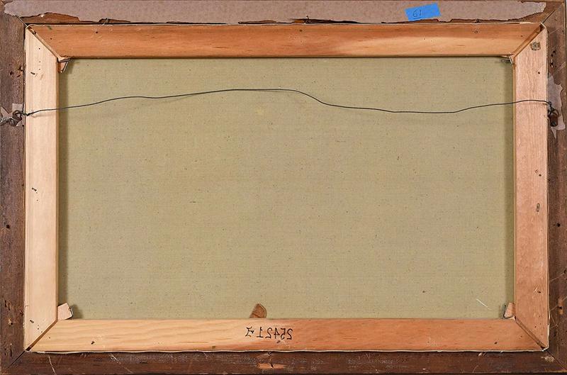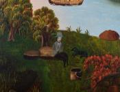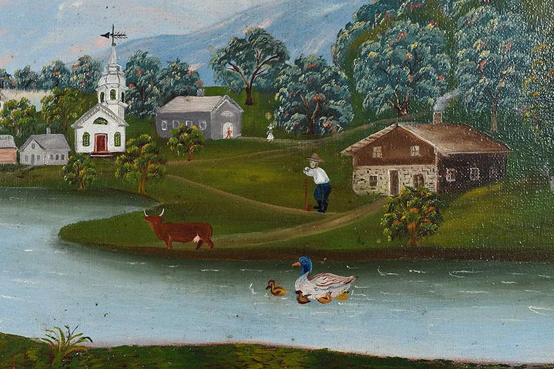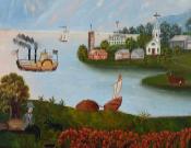 Naïve painting of a river scene, o/c, unsigned. This delightful painting features a paddle-wheeler flying an American flag, a village on the far shore, several people, animals, and mountains in the background. The painting is framed in a period carved giltwood frame. It is in very good condition, having been professionally conserved, lined, with minor in-painting. Late 19th/early 20th century, American.