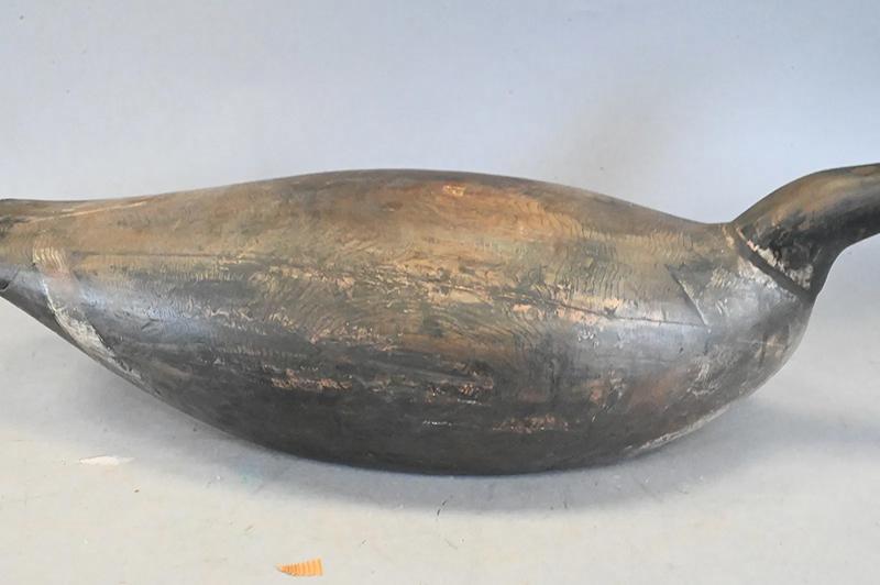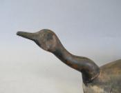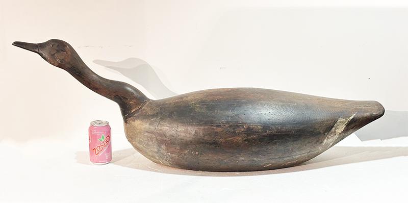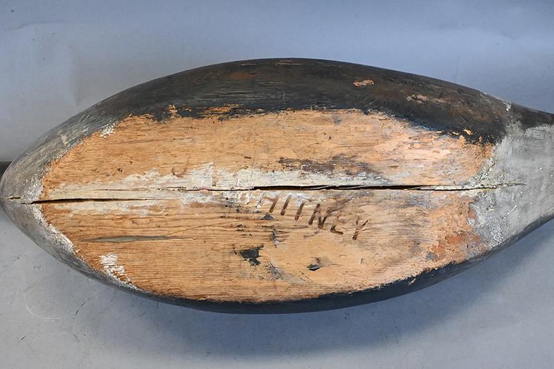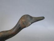 An oversized belligerent Canada goose decoy. This goose is of two-piece construction, (body and head), and retains most of its original paint. A brand on the bottom identifies the maker as J. A. Whitney of Falmouth, Maine This decoy is very sculptural and would certainly make a conversation piece wherever it might be placed. Very good condition. Early 20th century, Maine.