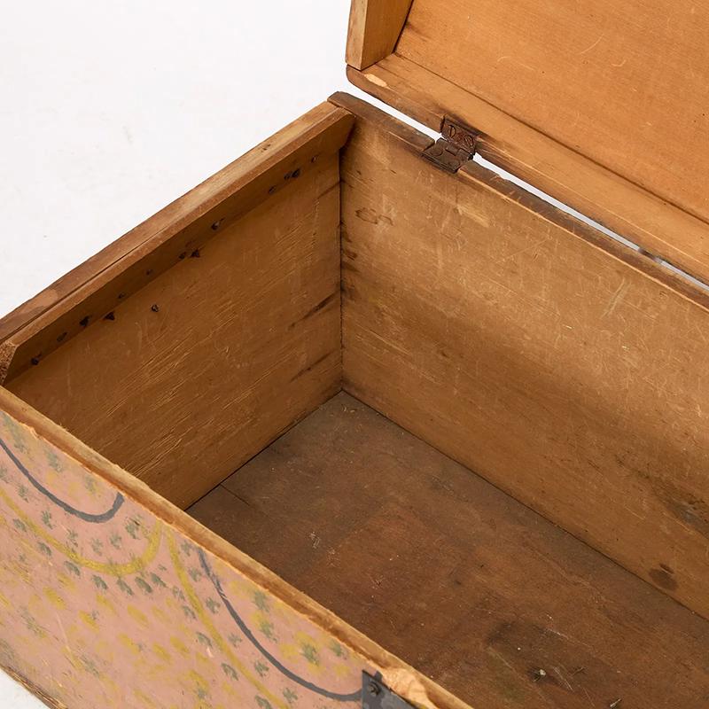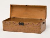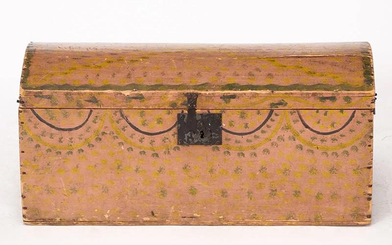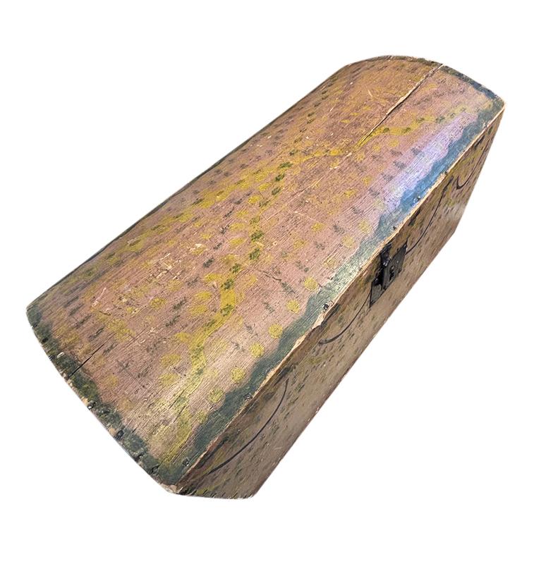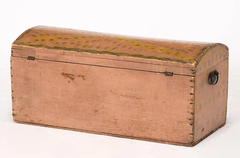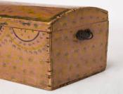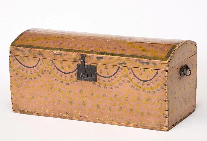 Paint decorated dome-top box, pine. This nail-constructed box sports a hinged lid and is painted with black and yellow swags and green and yellow dots on a light salmon ground. It is in good condition, considering its age, with two shrinkage cracks on the lid and the expected wear from age and usage. Mid-19th century, New England.