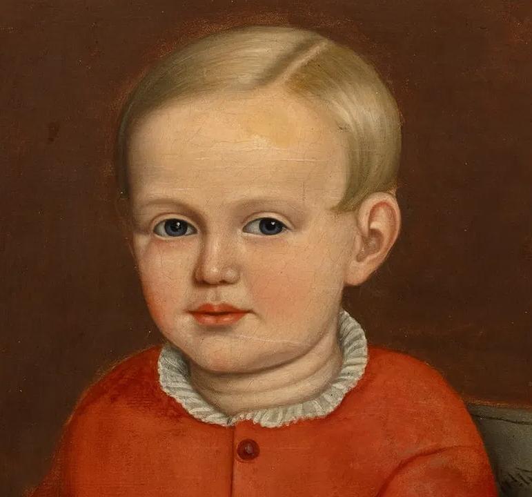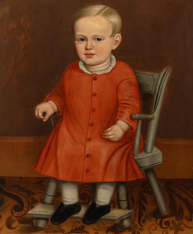Portrait of a boy in a red dress, o/c, unsigned. The boy is pictured sitting in a child’s fancy chair that rests on a patterned carpet. The painting is in good condition, relined, with craquelure, and with a small restoration in the boy’s forehead and on the proper left shoulder. Circa 1830, American School.