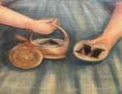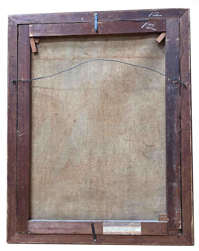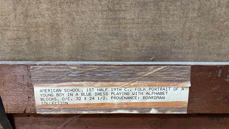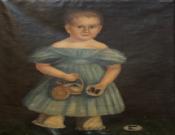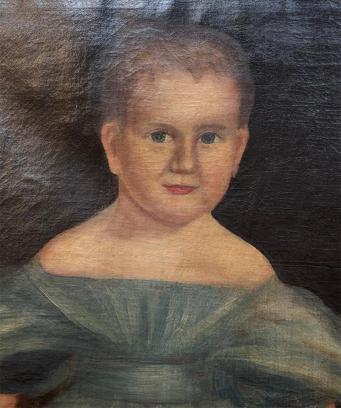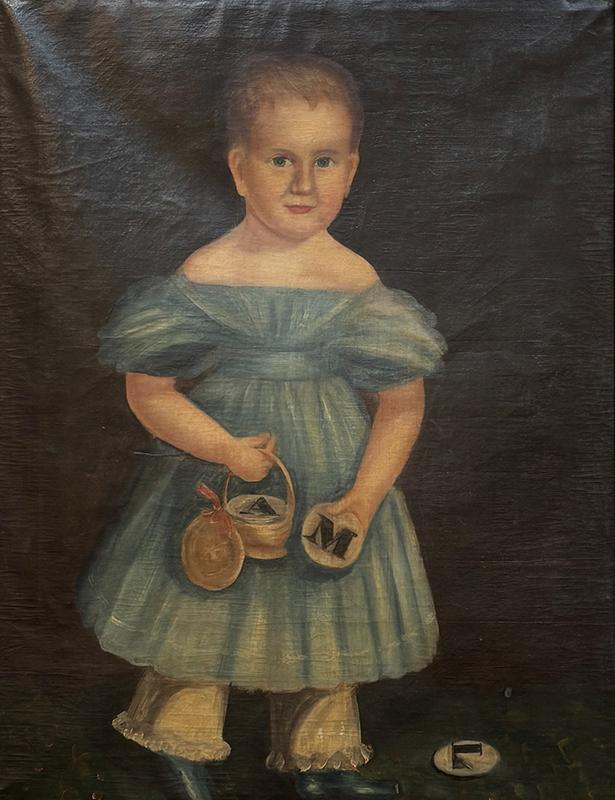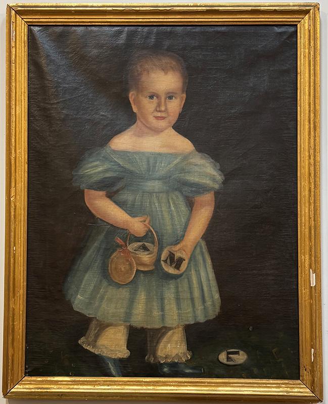 Portrait of a boy, o/c, unsigned. In this full-length portrait, the boy is depicted wearing a blue dress and blue pantaloons and holding a basket containing discs from an alphabet game. The painting is in very good condition, but with some looseness to the canvas and minor damage to the frame. Circa 1840, American.
