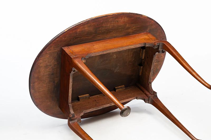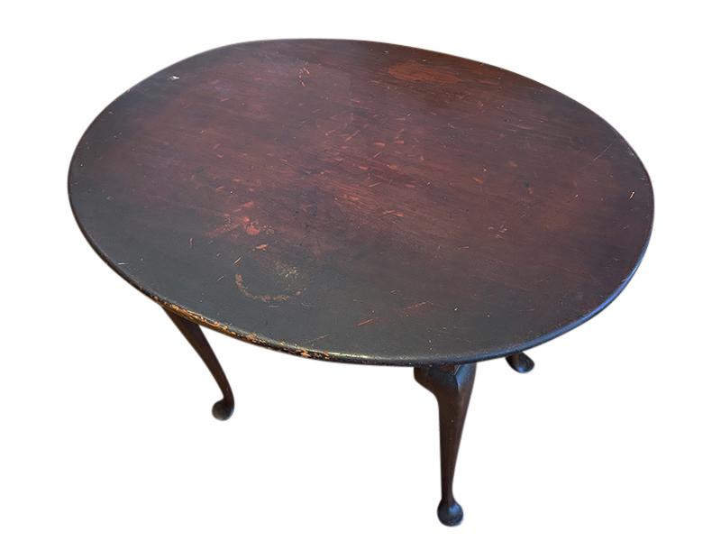 Queen Anne tea table, maple and pine. The table sports an early 19th century oval pine top with rounded edges on an 18th century Queen Anne maple base supported by cabriole legs ending in pad feet. It has beautiful form, proportions and color and is in good condition, with wear consistent with its age. New England origin.