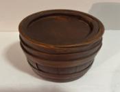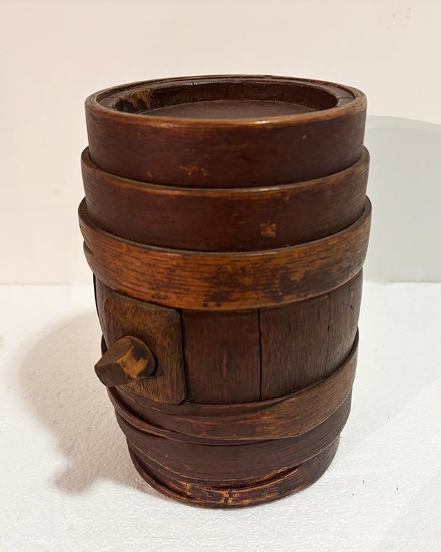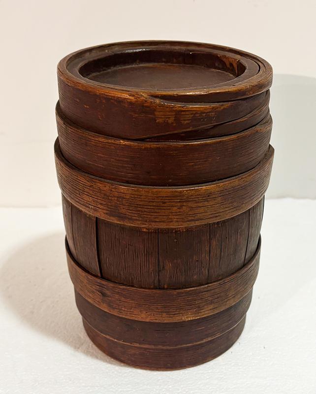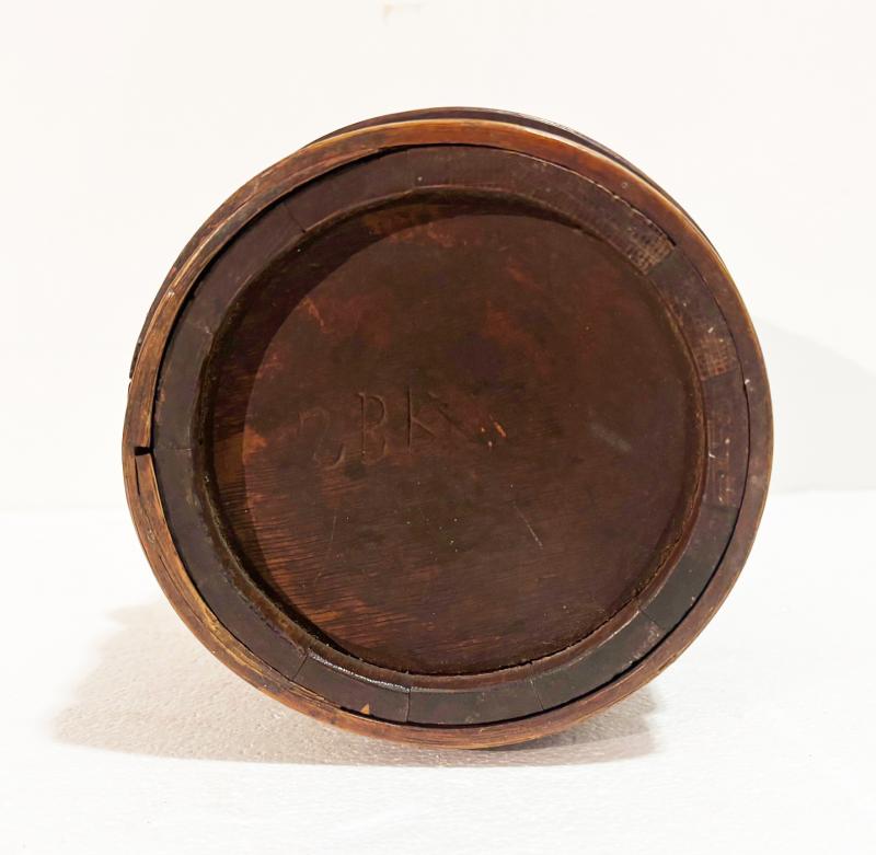 A soldier’s wooden barrel keg-form field canteen. The canteen sports original red paint and a fingered staved construction with fitted ends and the original wooden plug. One end has scratched initials, “BK”. The canteen is in very good condition, marred only by a tiny crack in one of the staves and the expected wear from age and usage. 19th century, American.