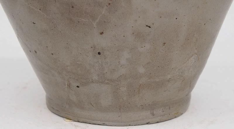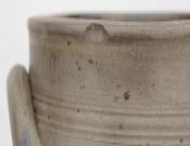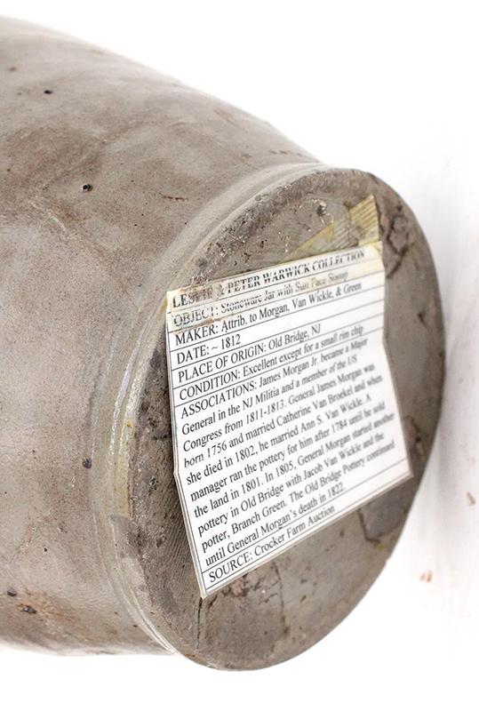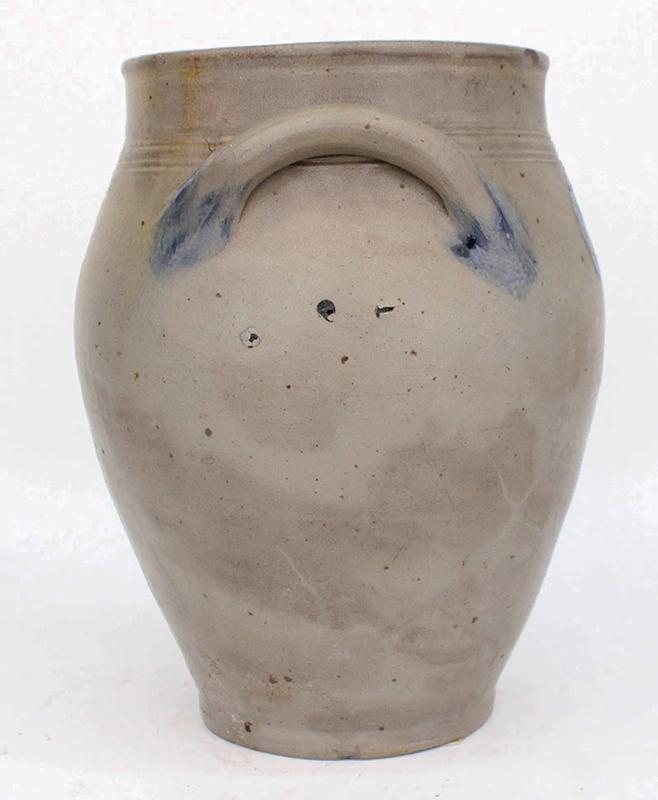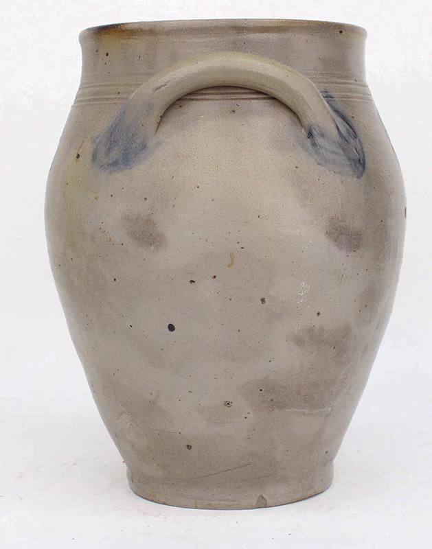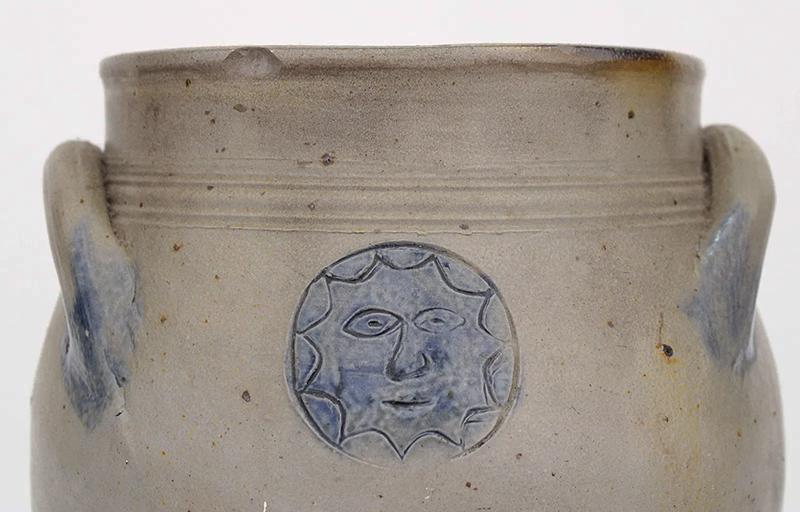 Ovoid stoneware jar with a sun face decoration. The jar has a tooled shoulder and applied lug handles, and is decorated on reverse sides with an impressed and cobalt-highlighted medallion featuring a face surrounded by rays. This rare jar was made by the Xerxes Price Pottery in Sayerville, NJ. The pottery was started by James Morgan, Jacob Van Wickle, and the potter Branch Green in 1805. Morgan was a Major General in the NJ Militia and a member of the U.S. Congress from 1811-1813. The jar is in overall good condition, with some rim chips, (one of which occurred during the making), some blemishes in the finish and chips to the foot. Circa 1810, New Jersey.