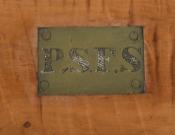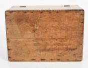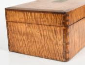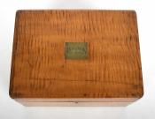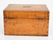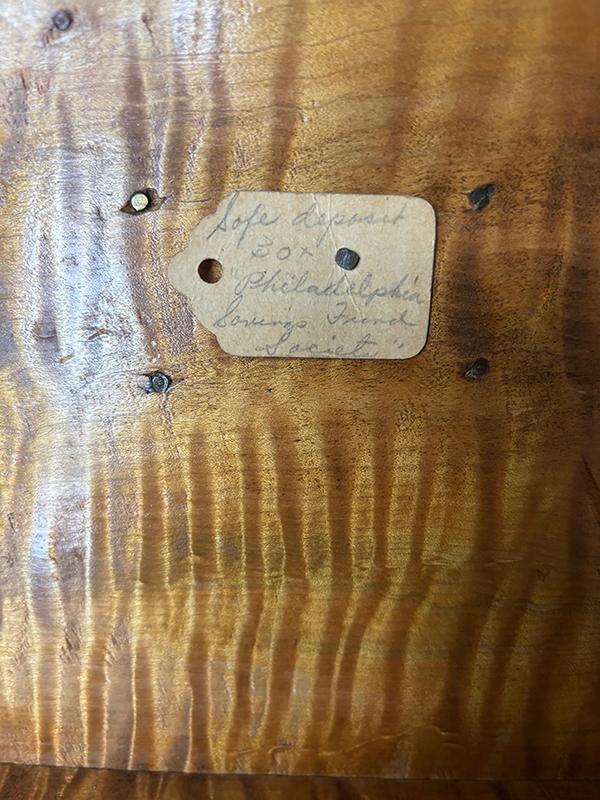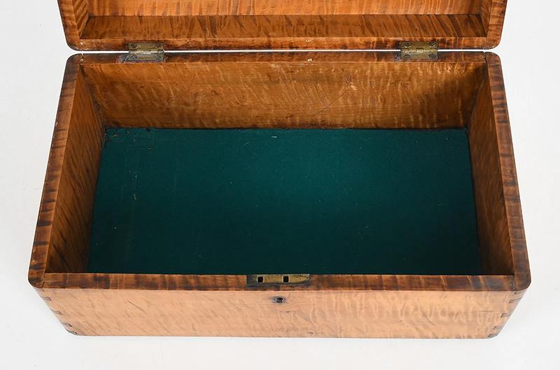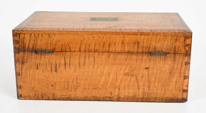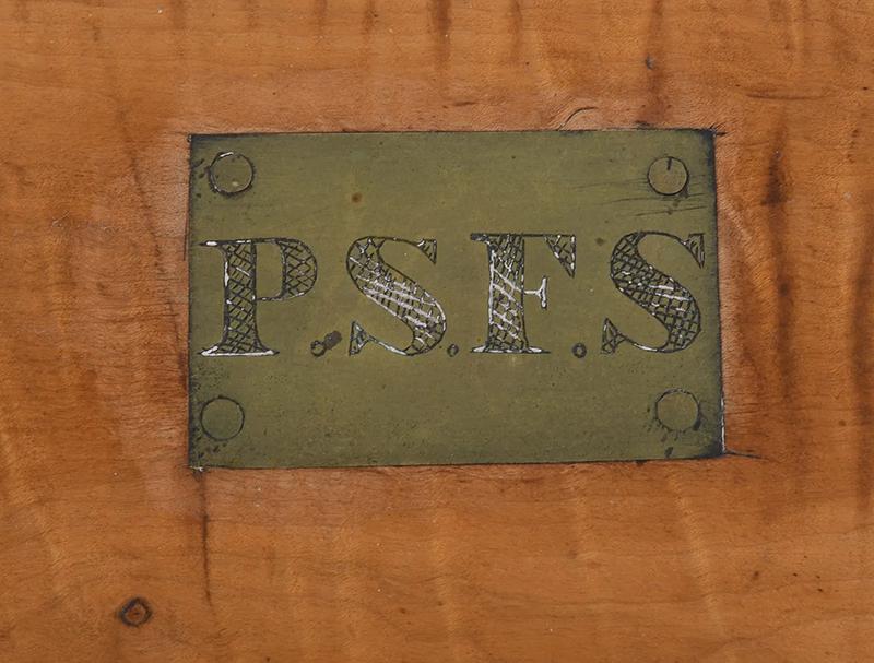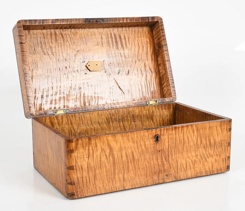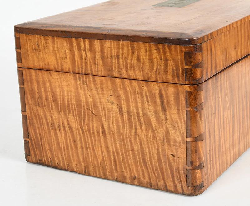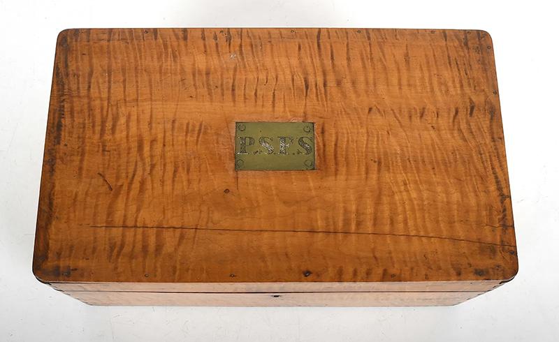 Tiger maple box. The box sports strong tiger maple striping, dovetailed construction and a chamfered lid with an inset brass plaque bearing the initials “P.S.F.S”, indicating that the box was associated with the Philadelphia Savings Bank Society. A tag attached to the underside of the lid states it was used as a safe deposit box. Founded in 1816, the Philadelphia Savings Bank Society was the first savings bank to organize and do business in the United States. The box is in very good condition, marred only by a tight shrinkage crack in the lid. Circa 1860, Philadelphia.