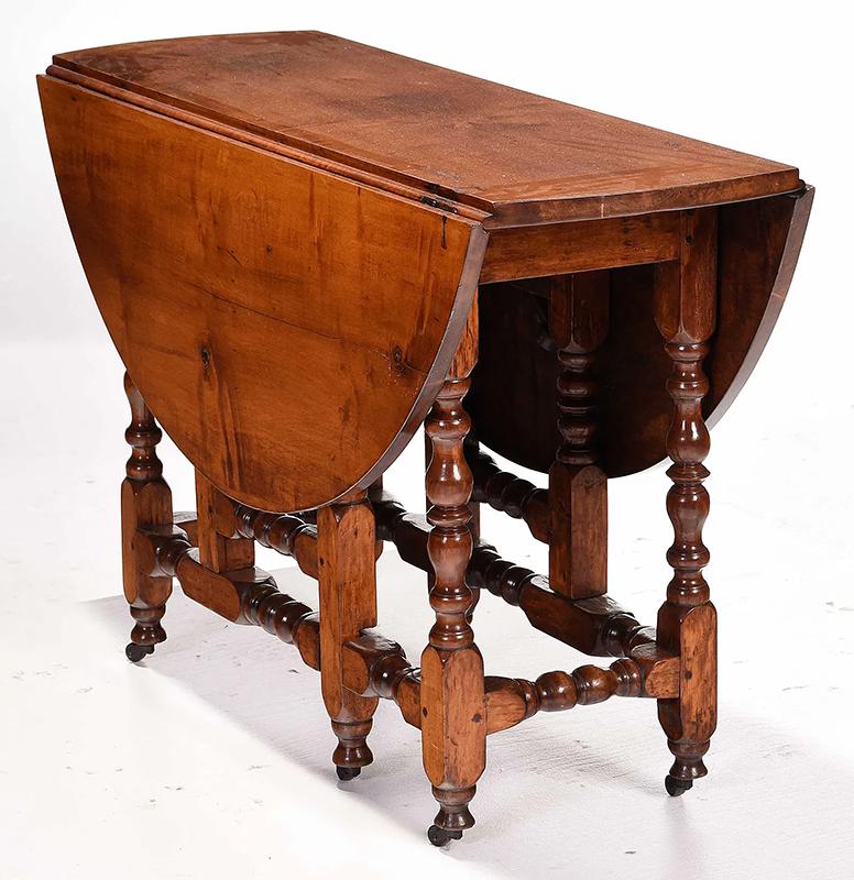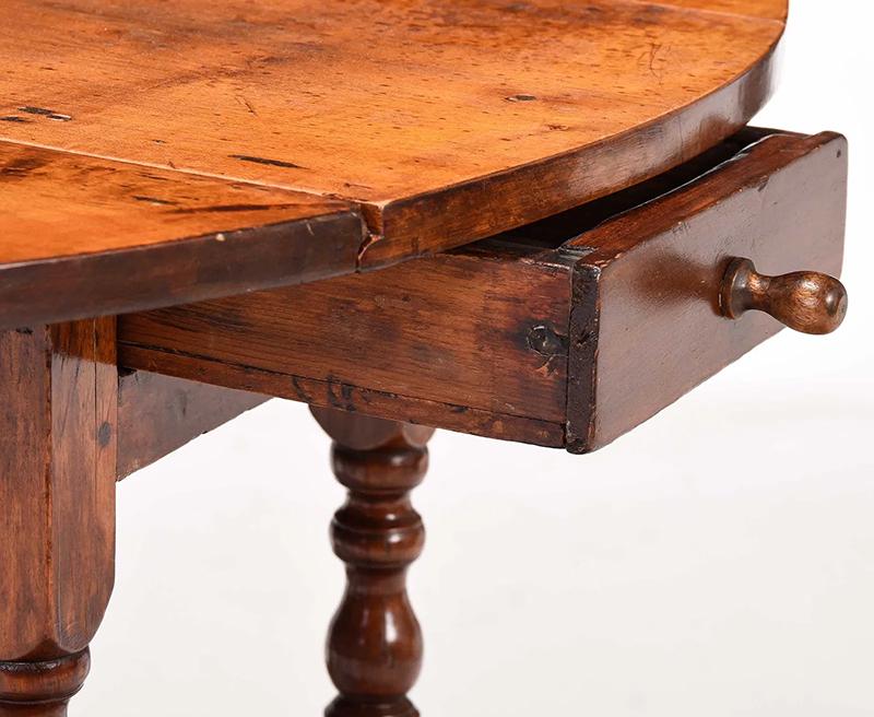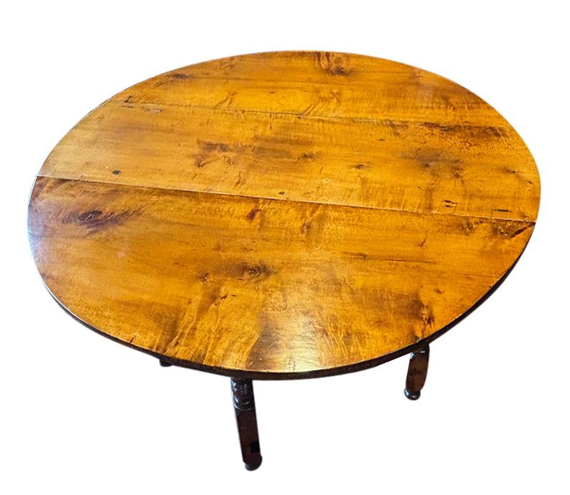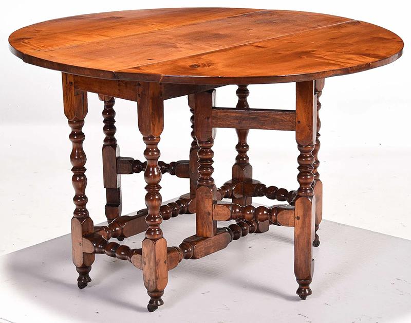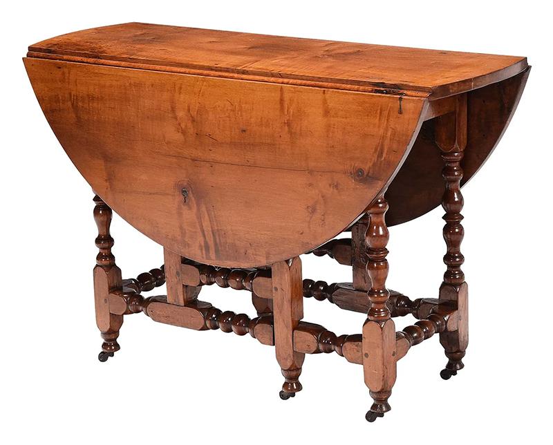 William & Mary gate-leg table, figured maple. The table sports a single drawer, excellent early turnings on the legs and stretchers, and a warm old finish. It is in very good condition for its age, with scars on the underside of the top from additional hinges, (now removed), and some staining on the top. From an old collection. Circa 1730-1750, New England.