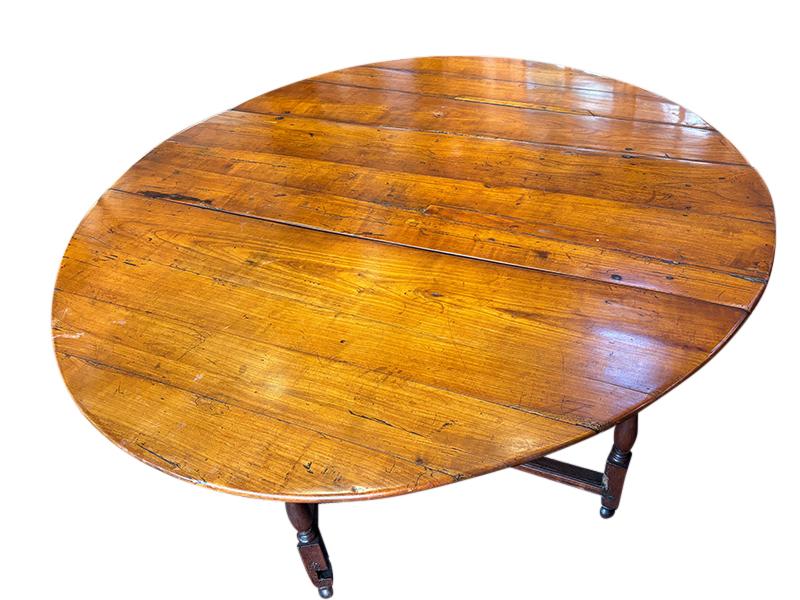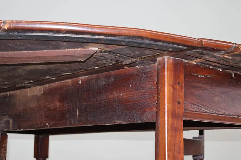 William & Mary gateleg dining table, apple and cherry wood. This unusually large gateleg table sports a beautiful oval top made of apple wood, with original butterfly hinges and chestnut straps attached with rose-headed nails. Custom-forged iron straps were added to reinforce the table. The table is in very good condition, with only minor repairs. Dated by Peter Kenny, formerly of the Metropolitan Museum of Art, as circa 1750, Manhasset, Long Island, NY.